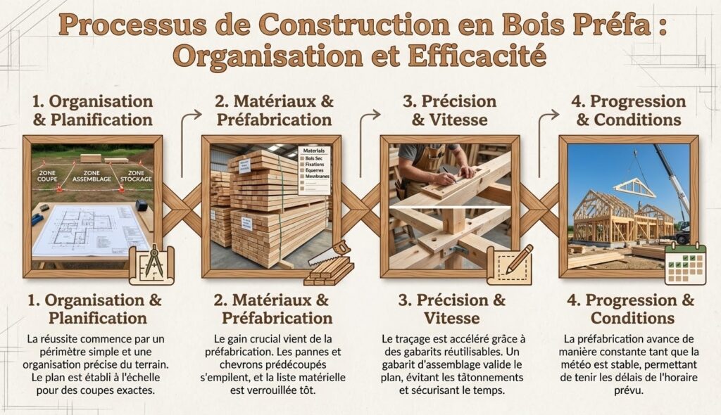 La réussite passe d’abord par un périmètre simple, puisque la portée courte réduit les risques. Le terrain s’organise au cordeau, en effet, avec zone coupe, zone assemblage, zone stockage. Le plan s’établit proprement à l’échelle, puisque chaque coupe précise dépend des entraxes. Le gain crucial vient de la préfabrication, par conséquent, pannes et chevrons prédécoupés s’empilent.
