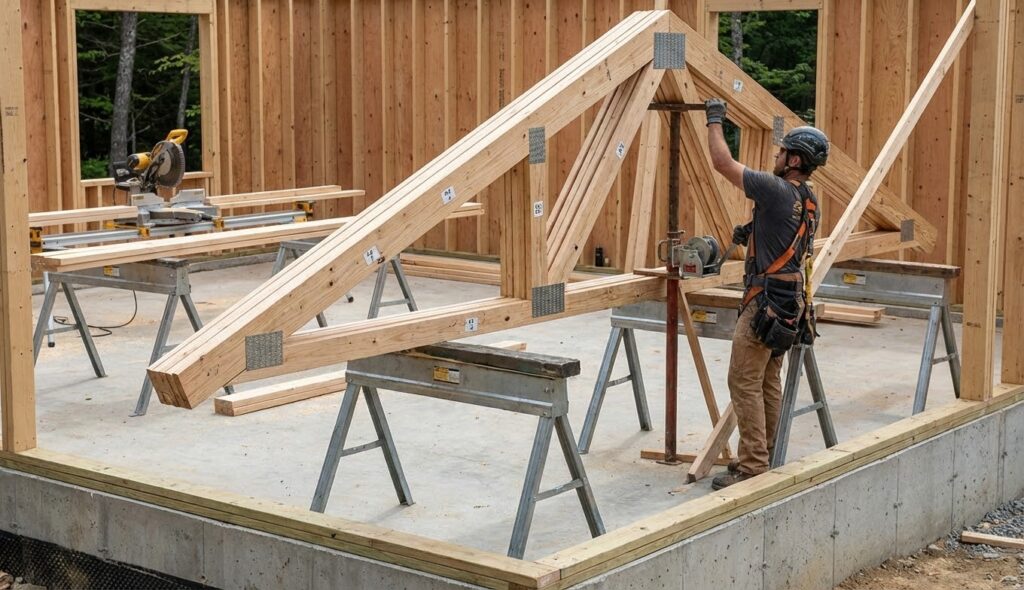 Le montage suit un ordre fixe, ainsi, lisse basse, montants, lisse haute, puis chevrons. La rapidité s’obtient avec des connecteurs standard, en comparaison, les entailles complexes ralentissent tout. Le poste coupant travaille en avance, puisque les longueurs numérotées arrivent prêtes au vissage. Le levage s’organise avec tréteaux et étais, voilà pourquoi un guide sécurité rassure.