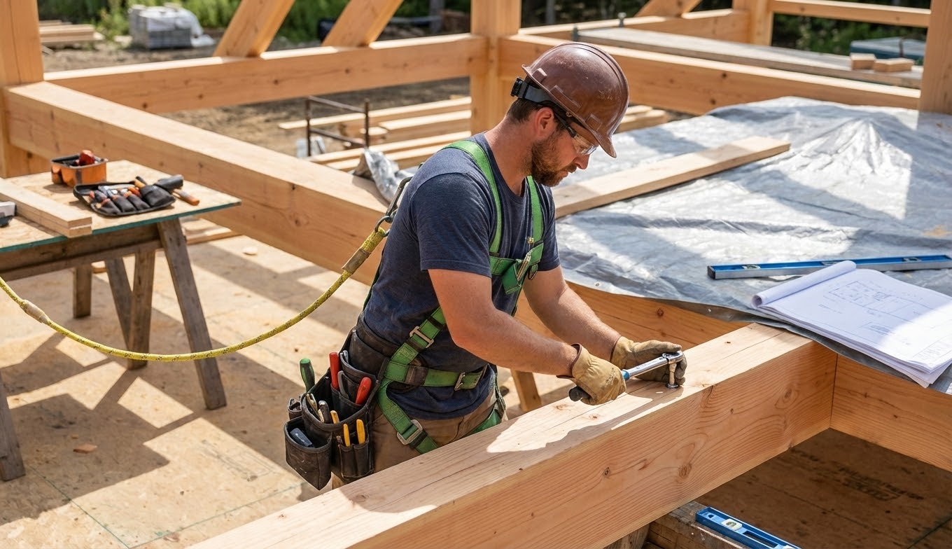 La sécurité impose des EPI adaptés, en d’autres termes, gants, lunettes, casque, harnais éventuel. Le poste de travail reste propre, pourtant, les chutes rangées évitent glissades et pertes d’outils. Le bois se protège aussitôt par un écran, ainsi, les pluies n’altèrent ni équerrage ni planéité. Les fixations sont serrées au couple raisonnable, dès lors, les ruptures par cisaillement régressent.