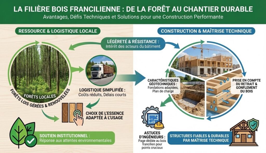 Pour réussir un chantier, il faut respecter les caractéristiques géotechniques locales. En effet, les sols peuvent exiger des fondations plus profondes et un plan de charge adapté. La conception doit, pourtant, prendre en compte le retrait et le gonflement du bois. Des ingénieurs partagent des astuces dans la page dédiée au bois francilien, qui détaille ces points cruciaux. Ainsi, la maîtrise des paramètres techniques favorise des structures fiables et durables.