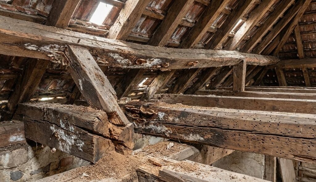 Quand le bois perd sa cohésion, la réparation cesse d’être fiable durablement. Les pièces deviennent friables au tournevis, en effet la matière s’effrite et se pulvérise. Une flèche marquée sur pannes ou chevrons signale, par conséquent, une perte de portance préoccupante. Le bois atteint par champignons lignivores indique, en réalité, une dégradation interne souvent irréversible.