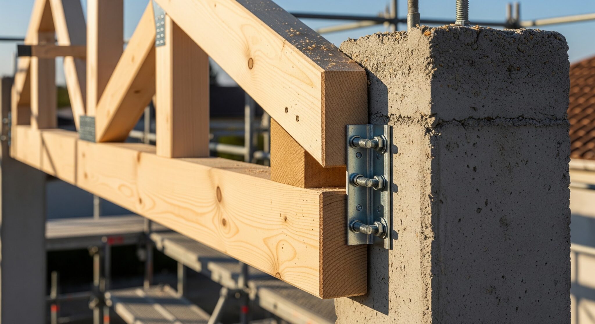 Le système de fixation doit aussi prendre en compte la protection contre l’humidité. Le bois en contact direct avec le béton peut rapidement pourrir sans l’installation appropriée. Pour cela, il est recommandé d’intégrer des platines métalliques galvanisées ou des supports en acier inoxydable. Ces éléments permettent de surélever légèrement le bois et d’éviter le contact direct avec la surface humide du béton. Par ailleurs, la norme DTU 31.1 détaille les types de connecteurs et leurs utilisations spécifiques. Elle régule les pratiques pour garantir la durabilité structurelle face aux contraintes climatiques.