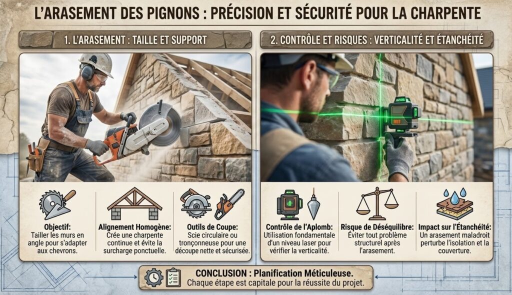 En revanche, il est fondamental de vérifier la verticalité des pignons après arasement afin d’éviter tout déséquilibre. Pour cela, l’utilisation d’un niveau laser permet de contrôler précisément l’aplomb. Aussi, un arasement maladroit peut compromettre l’étanchéité car il perturbe la pose des matériaux d’isolation et de couverture. Voilà pourquoi chaque étape doit être méticuleusement planifiée.