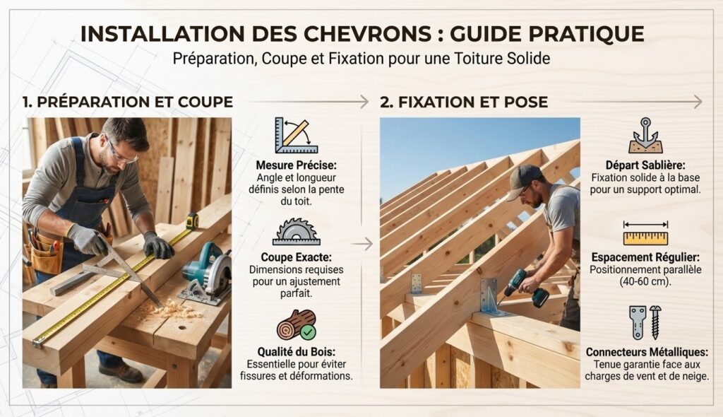 L’installation commence par une préparation soignée des chevrons, qui doivent être coupés selon les dimensions exactes requises. Pour cela, il faut mesurer chaque branche selon l’angle et la longueur nécessaire, en tenant compte de la pente du toit. En outre, la qualité du bois est essentielle pour éviter tout risque de fissures ou de déformation après l’installation.