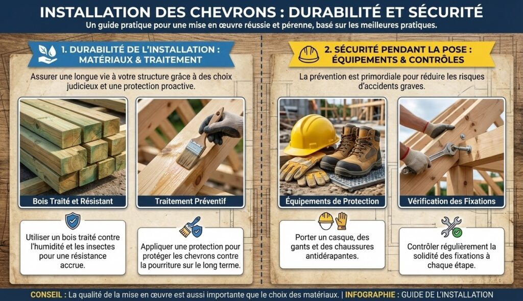La durabilité de l’installation dépend principalement du choix des matériaux, mais aussi de la mise en œuvre. Il est recommandé d’utiliser un bois traité, résistant à l’humidité et aux insectes. De plus, appliquer un traitement préventif protège les chevrons contre la pourriture sur le long terme.