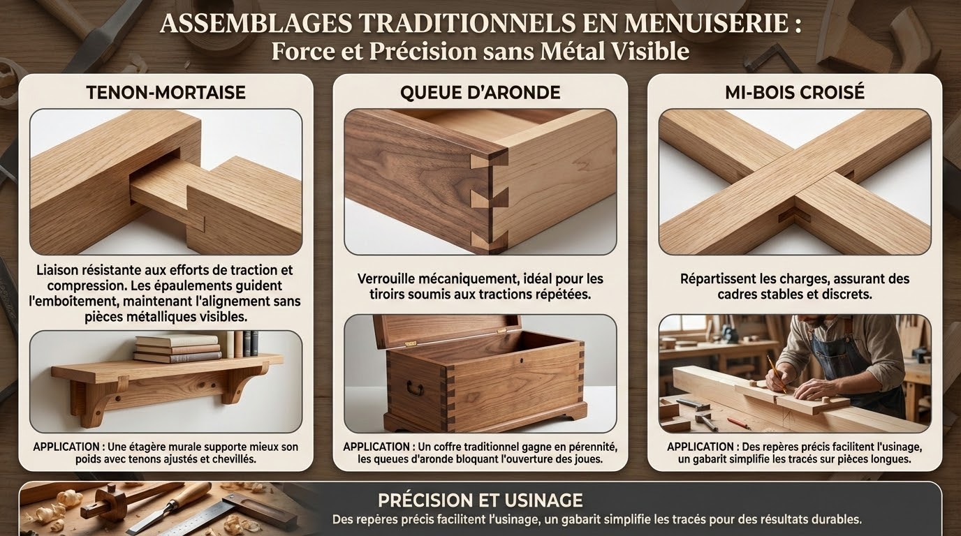 Le tenon-mortaise assure, en réalité, une liaison résistante aux efforts de traction et compression. Les épaulements guident l’emboîtement, donc la géométrie maintient l’alignement sans pièces métalliques visibles. La queue d’aronde verrouille mécaniquement, en revanche, les tiroirs soumis aux tractions répétées. Les mi-bois croisés répartissent les charges, ainsi les cadres restent stables et discrets.