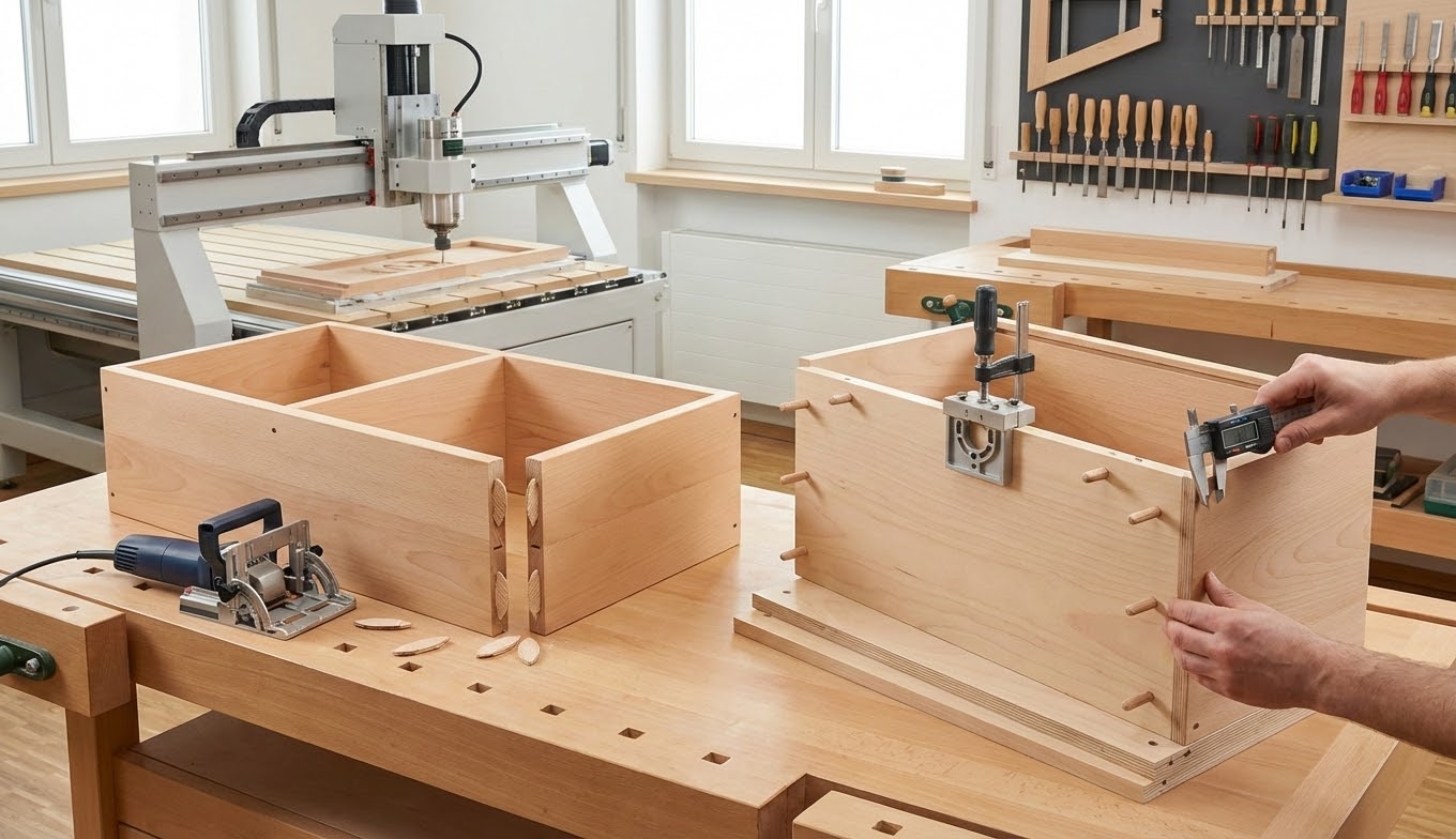 Les lamelles alignent les chants, donc la surface colle mieux et répartit les contraintes. Les tourillons centrés apportent, ainsi, un pointage fiable pour des montages répétés. L’usinage numérique garantit, dès lors, des tolérances proches du dixième de millimètre. Un gabarit de perçage assure, en somme, des alignements nets sur séries d’éléments.